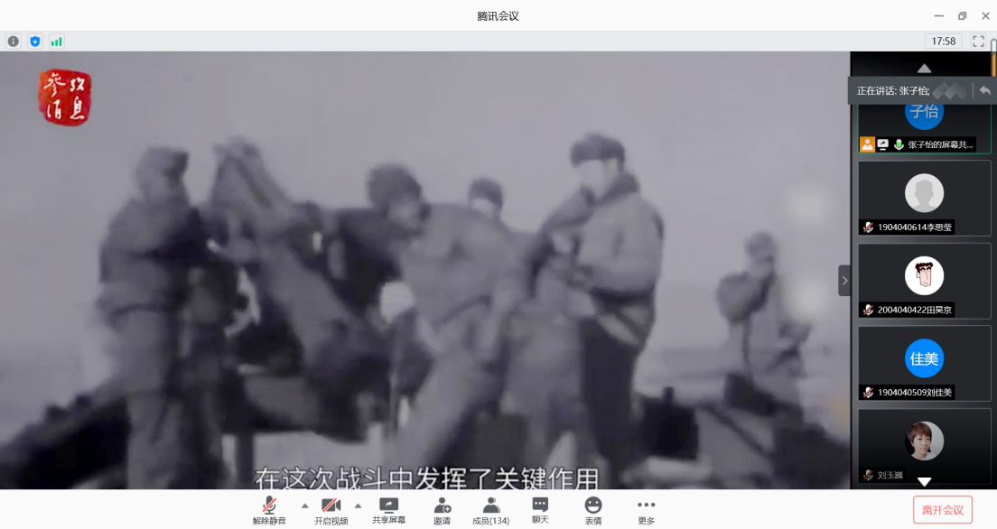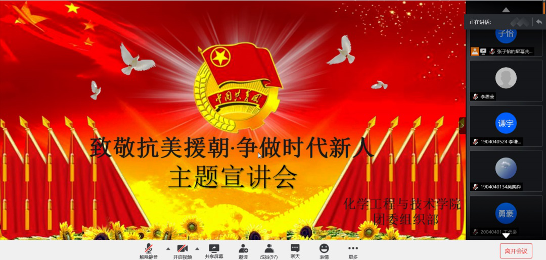 铭记抗战历史,传承红色基因。2020年10月28日晚九点半,化学工程与技术e世博 团委在腾讯会议召开“致敬抗美援朝,争做时代新人”主题宣讲会,校团委副书记刘玉巍老师出席会议,18、19、20级学生代表参加会议。
