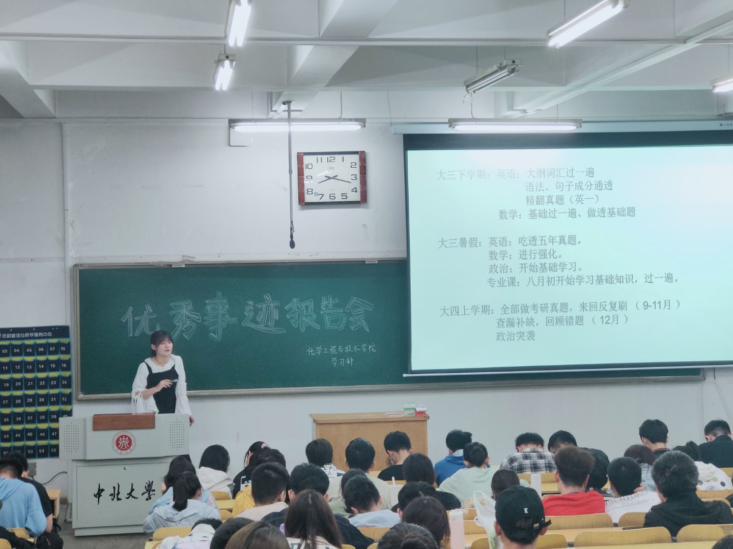 的大四学姐吕佳义,与霍欣怡学姐不同的是,她先通过视频为同学们阐述了“人生不止于悲喜,不负青春不负己”的道理,然后将考研的流程为大家娓娓道来。人而不学,其犹正墙面而立。治学如苦海泛舟,希望同学们也能遇见与自己同舟共济的伯牙子期。之后分享的是来自特种能源技术与工程专业的刘睿学长。他从考研的成绩大的要求讲起,分析了在大学中参加各项竞赛对考研的助力,也介绍了自己对考研与就业的取舍。可谓“听君一席话,胜读十年书”!