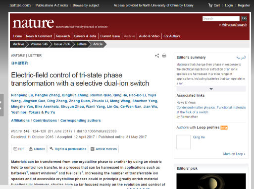 e世博2008届优秀毕业生鲁年鹏以第一作者身份在《Nature》杂志发表题为Electric-field control of tri-state phase transformation with a selective dual-ion switch的研究论文,在国际上首次报道电场诱导下的双离子调控可逆结构相变,发现了全新的物相,并揭示了相变所对应三种结构的奇异光学、电学和磁学特性,为电场调控光、电和磁性的器件应用提供了全新的可能。