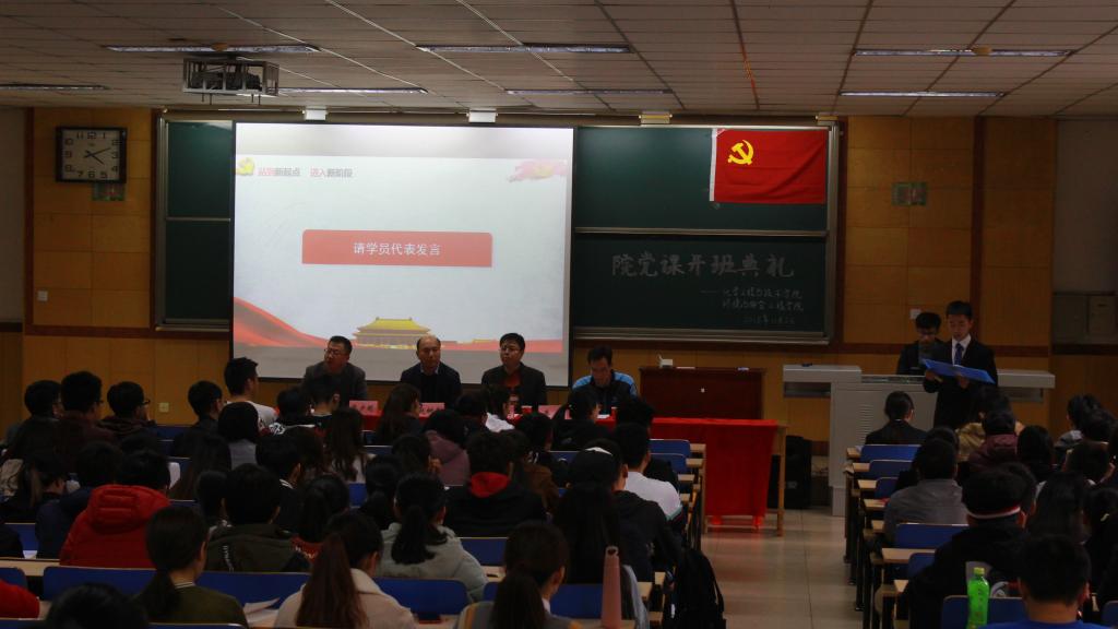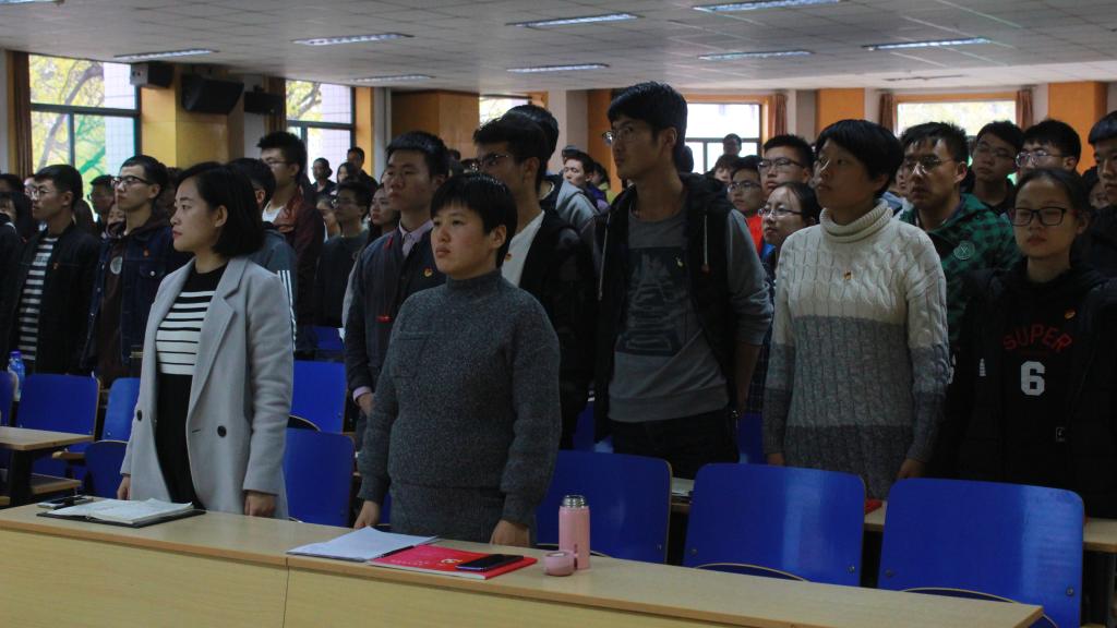 大会开始,全体成员庄严地高唱国歌。之后由廖海洪书记讲话,他对在场入党积极分子给予了鼓励,提出了“信、学、知、行”四点希望。并表示青年大学生要明确党的组织和纪律。通过学习党的基本知识、党的各种理论和党的方针、路线、政策,不断提高自身的政治思想觉悟。引用校训“致知于行”要求各位同学要把这些知识落到实处,做到这四点才能成为一名光荣的共产党员。讲话结束后,工作人员宣读《入党积极分子考评办法》。接着,学生代表吴凯旋进行发言,他对在场的同学寄予其真挚的希望。最后由赵树森书记对大会进行总结,强调党课的意义,对全体成员提出建议并且指明学习方向。