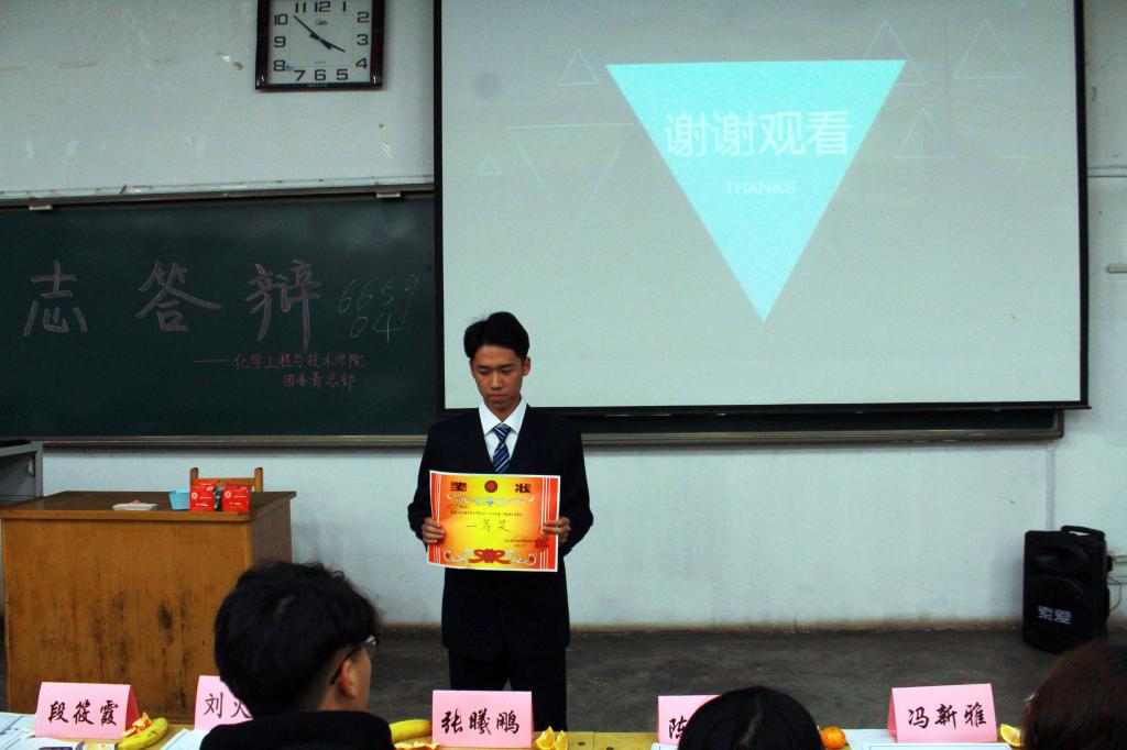 答辩按照抽签顺序进行。各青志队长以视频或ppt的形式对各青志支队前期进行的青志活动进行介绍、总结和反思。各位评委根据活动内容对各青志队长的表现作出了点评并提出了建议,重点强调了青志活动的安全问题以及活动内容的实在性。此次活动中,我们看到了来自不同支队的爱心与创意。“环抱优美城市,净享文明校园”,清洗共享自行车有他们的身影;“人生都有夕阳红,尊老爱幼树新风”,敬老院里有他们的身影;“低碳生活,让地球不再低叹”,居民小区有他们的身影……最后,化学工程与技术e世博