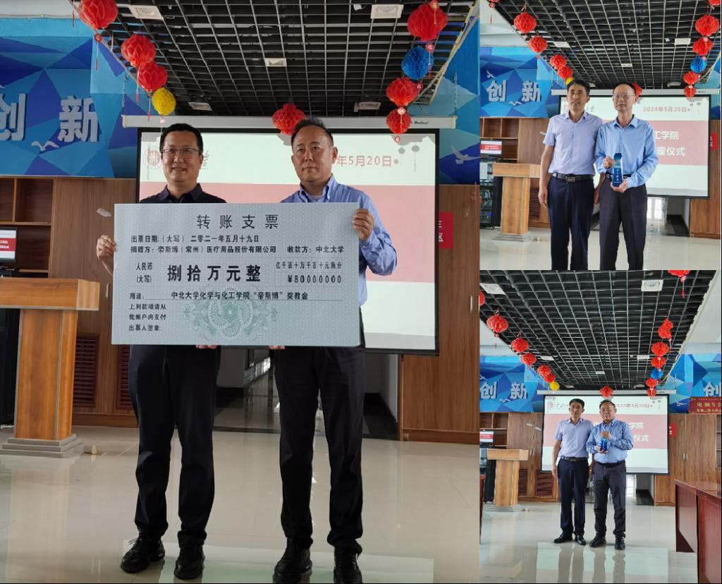 国内交流合作部部长刘国东接受帝斯博(常州)医疗用品股份有限公司董事长张柱华先生的捐赠,并为张柱华校友颁发捐赠证书。