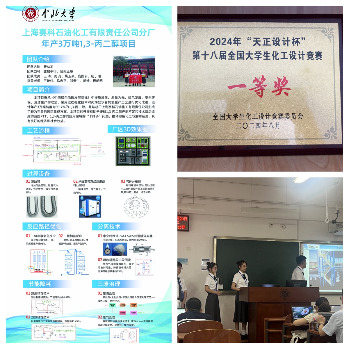 2021级化工专业本科生王涛、焦玉豪、周丹、庞国轩、杨丁瑜5位同学组成)完成的作品——“上海赛科石油化工有限责任公司分厂年产3万吨1,3-丙二醇项目”,在工艺选择、设备设计与选型、自动控制、本质安全、清洁生产、三维工厂等方面开拓创新,精彩的汇报展示与答辩得到了评委的一致认可,历经山西省省赛、西北区赛、全国总决赛,从全国450所高校,3685支队伍中,一路拼搏,最终获得西北赛区特等奖、全国总决赛一等奖,并获西北赛区工程图纸与设计文档优秀奖。这是我校自参加全国大学生化工设计竞赛以来,已连续11年代表西北赛区参加全国总决赛,并获得全国一等奖,这一优异成绩体现了e世博