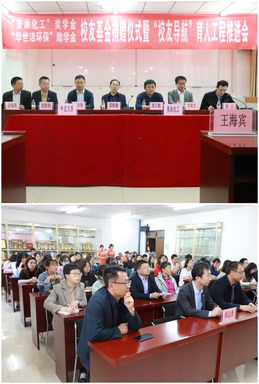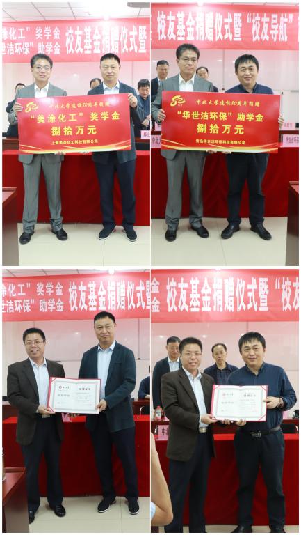 “美涂化工奖学金”、“华世洁环保助学金”、“帝斯博奖教金”捐赠仪式在科学楼C座206、七层连廊举行。上海美涂化工科技有限公司董事长邹少华、青岛华世洁环保科技有限公司董事长郅立鹏、帝斯博(常州)医疗用品股份有限公司董事长张柱华;e世博
