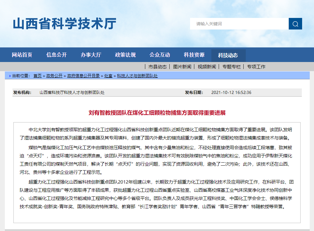 刘有智教授领军的超重力化工过程强化山西省科技创新重点团队近期在煤化工细颗粒物捕集方面取得了重要进展。该团队发明了湿法捕集细颗粒物的系列超重力捕集器及其专用填料,创建了国内外最大的错流超重力装置,形成了细颗粒物湿法捕集成套技术与装备。
