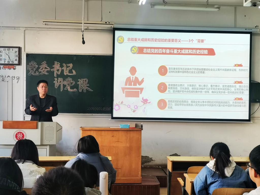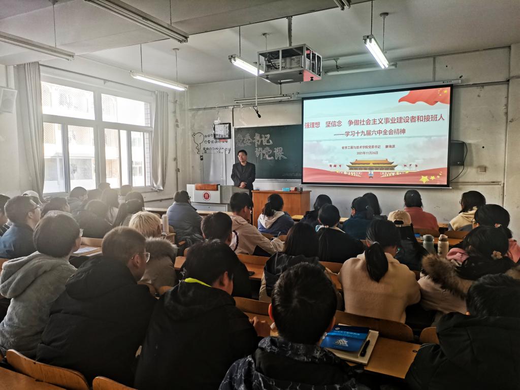 廖书记以“强理想、坚信念,争做社会主义事业建设者和接班人”为主题向同学们宣讲十九届六中全会精神。他首先介绍了十九届六中全会的基本概况;其次宣讲了十九届六中全会的重要精神,重点围绕党的四个历史时期、四个伟大飞跃、党的百年奋斗的5大历史意义、党的百年奋斗的10大历史经验、党的十八大以来13方面的重要成就等方面进行了解读。最后廖书记指出:党的十九届六中全会是在重要历史关头召开的一次具有重大历史意义的会议,是在党的历史上具有里程碑意义的重要会议。全会全面总结了党的百年奋斗重大成就和历史经验,充分体现了我们党重视和善于运用历史规律的高度政治自觉,牢记初心使命、继往开来的责任担当。深入学习贯彻党的十九届六中全会精神,是当前重大的政治任务。我们要坚决贯彻落实全会精神,立足当下、着眼未来,埋头苦干、勇毅前行,努力为党和人民赢得更大的胜利和荣光。