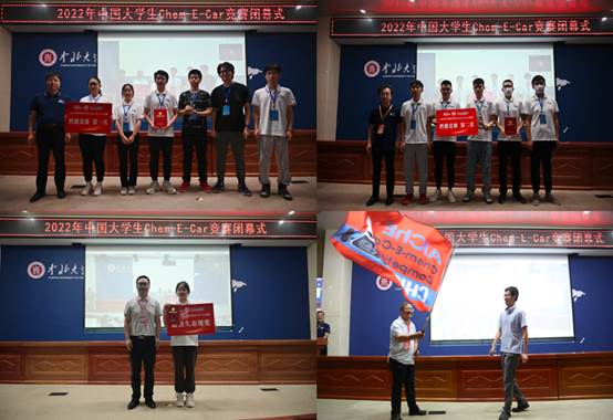 、大连理工大学、中国石油大学(华东)、天津大学;我校获得“最持久表现奖”;我校和大连理工大学荣获“最佳海报奖”;南京工业大学、浙江大学荣获“最佳安全奖”;天津大学荣获“最具创意驱动系统奖”;山东理工大学、中南大学荣获“竞赛精神奖”;安徽师范大学、西安石油大学、石河子大学荣获“杰出体育道德奖”;哈尔滨工业大学(威海)和中山大学荣获“金轮胎奖”;南京工业大学、四川大学荣获“最佳视频奖”。与会领导和嘉宾为获奖队伍颁奖。
