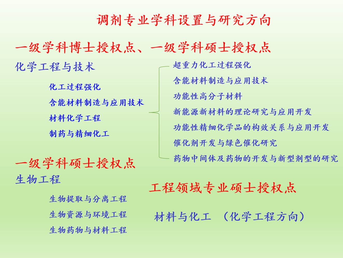 具有化学工程与技术一级学科博士学位和学术硕士学位授予权、生物工程学术硕士学位授予权以及材料与化工专业硕士授予权。化学工程与技术学科是山西省1331工程优势特色学科,设有博士后流动站,在教育部第四轮学科评估中达到B类水平。化学工程是山西省特色学科,应用化学是山西省重点建设学科。生物工程是目前山西省唯一的学术硕士学位授权点。