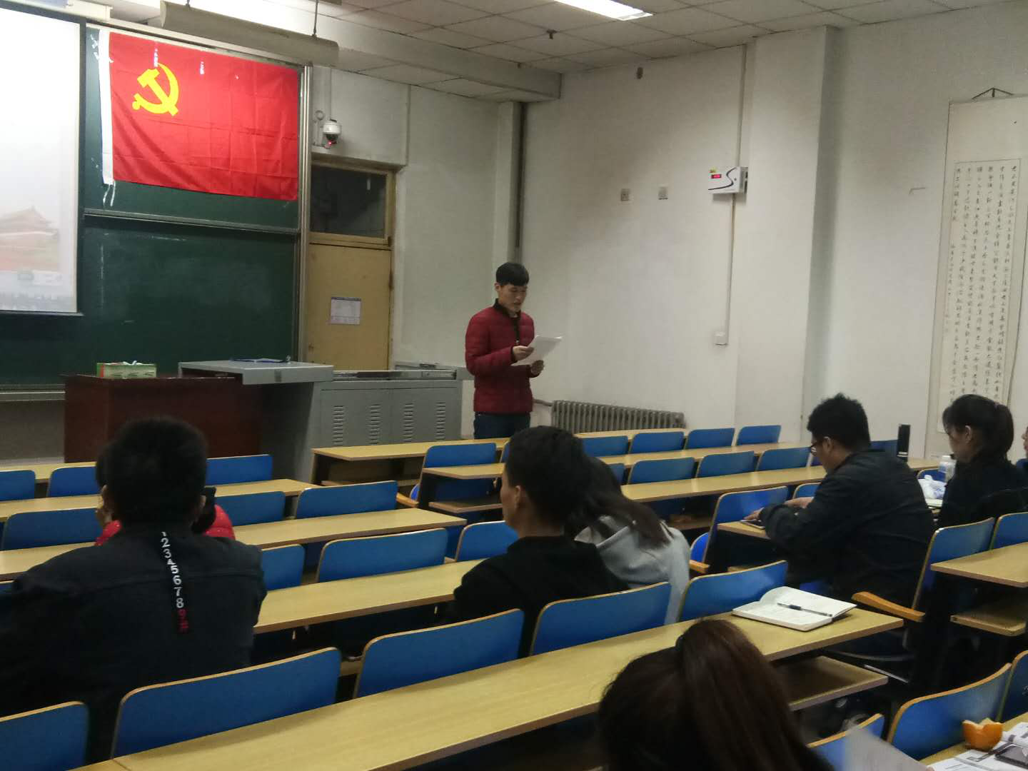 首先学生党员重温了入党誓词。在庄严的党旗下,同学们以宣誓的形式表达了对革命先烈诚挚的敬意和深深的怀念,时刻提醒自己身为党员的使命和义务。宣誓后段晴晴为大家系统地讲述了新修订后的《中国共产党纪律处分条例》,提醒各党员同志牢记使命、遵守纪律,不违规不犯法,做好人民的服务者。之后各位党员认真学习了《百家讲坛“平”语近人》第一期“一枝一叶总是情”,并进行了观影交流。各位党员将自己的观后感悟互相分享、相互促进,在激烈的讨论中加深了对于此次《“平”语近人》的理解和认识,深刻认识到习近平总书记对于人民的关心,激励了各党员同志向习近平总书记看齐,在习近平总书记的带领下做好人民公仆的决心。最后在段稀凡的带领下学生党员一同诵读了部分《党章》,强调了《党章》对于党员生活的重要指导作用。