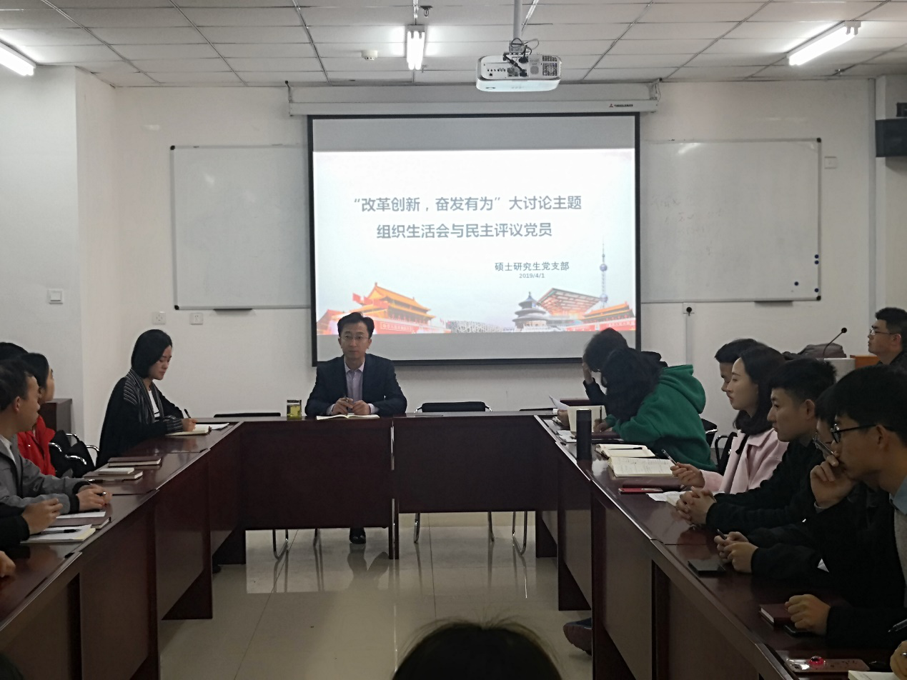 硕士研究生党支部召开“改革创新,奋发有为”大讨论主题组织生活会及民主评议党员,科研院长胡志勇老师莅临指导本次会议,硕士研究生党支部书记贾苗苗同志及党支部全体党员参加。