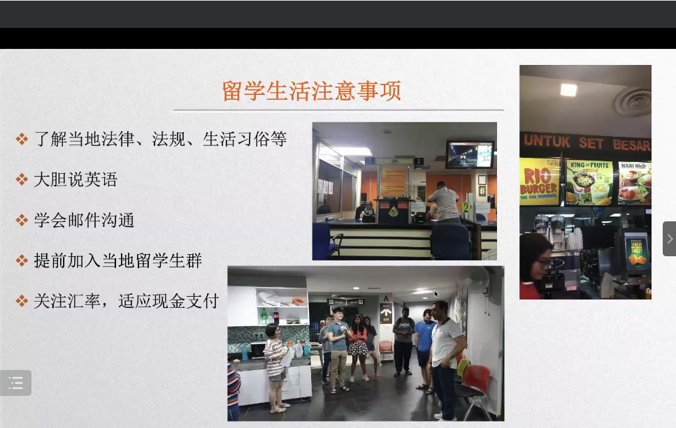高秀清老师通过自己的科研经历鼓舞了学生,介绍了自己的研究方向及科研成果,重点分享了自己国外求学的科研环境,让大家对国外大学硕博培养的科研环境有了初步了解。同时,高老师为同学们介绍了几种留学方案,包括语言学习和考试,个人资料准备以及签证办理等,使学生们进一步认知了留学必备条件及各项要求。最后,高老师分享了关于留学的注意事项,包括了解当地法律、法规、生活习俗;大胆说英语,学会邮件沟通;提前加入当地留学生群;关注汇率,适应现金支付等各方面细节,让学生们对国外生活的认识更加清晰。报告后,高老师跟同学们进行了简单的交流,并为同学们提供了相关的雅思备考等参考资料。