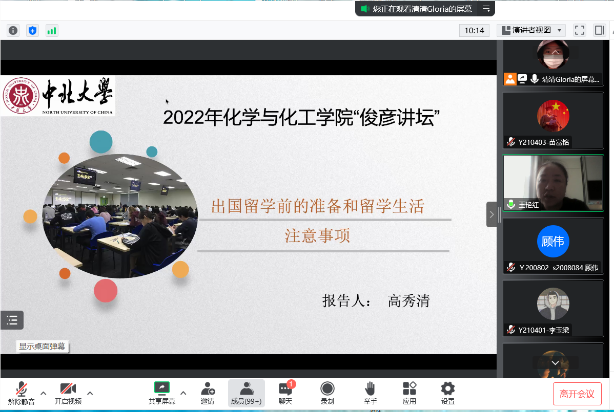 邀请了毕业于英国诺丁汉大学的青年教师高秀清老师,开展了一场题为《出国留学前的准备和留学生活》的“俊彦讲坛”讲座,为研究生们进行国际学术交流提供了思路,约300名研究生参加了此次报告。